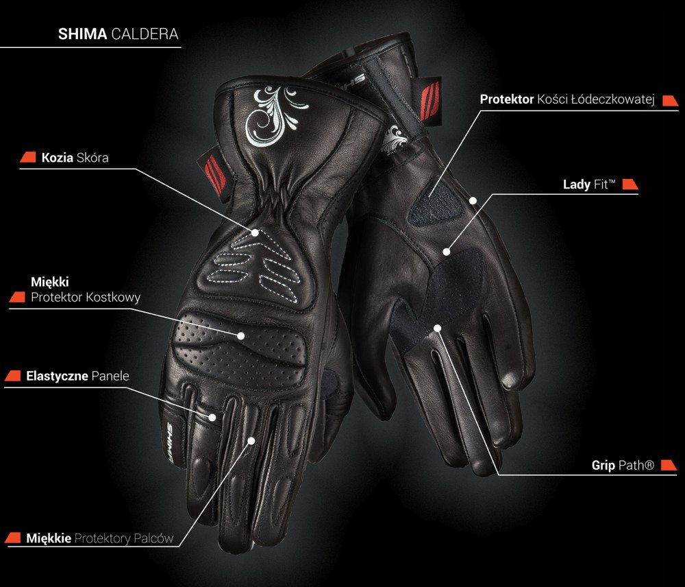 SHIMA Caldera to model rękawic przeznaczony dla kobiet. SHIMA Caldera wyposażona została w protektor główny wykonany z pianki amortyzującej impakt uderzenia oraz panele nadgarstkowe ze wzmacnianej tkaniny chroniącej przed przetarciem. Rękawice wykonane są ze skóry naturalnej ze wstawkami wentylacyjnymi pozwalającymi na lekką cyrkulację powietrza wokół dłoni. Specjalna konstrukcja damskich modeli rękawic SHIMA uwzględnia anatomię kobiecej dłoni - dłuższe palce, węższy obszar śródręcza oraz smuklejszą sylwetkę ręki.